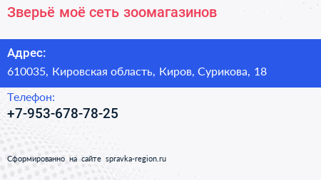 Зверьё моё, сеть зоомагазинов по адресу 610035, Кировская область, Киров, Сурикова, 18 в дальнейшем Организация, размещена в следующих категориях: