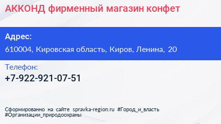 АККОНД, фирменный магазин конфет по адресу 610004, Кировская область, Киров, Ленина, 20 в дальнейшем Организация, размещена в следующих категориях: