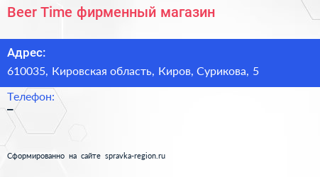 Beer Time, фирменный магазин по адресу 610035, Кировская область, Киров, Сурикова, 5 в дальнейшем Организация, размещена в следующих категориях:
