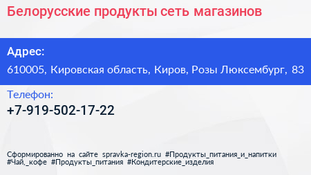 Белорусские продукты, сеть магазинов по адресу 610005, Кировская область, Киров, Розы Люксембург, 83 в дальнейшем Организация, размещена в следующих категориях: