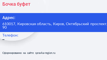 Бочка, буфет по адресу 610017, Кировская область, Киров, Октябрьский проспект, 90 в дальнейшем Организация, размещена в следующих категориях: