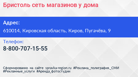Бристоль, сеть магазинов у дома по адресу 610014, Кировская область, Киров, Пугачёва, 9 в дальнейшем Организация, размещена в следующих категориях: