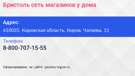 Бристоль, сеть магазинов у дома по адресу 610035, Кировская область, Киров, Чапаева, 11 в дальнейшем Организация, размещена в следующих категориях: