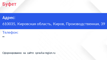 Буфет по адресу 610035, Кировская область, Киров, Производственная, 39 в дальнейшем Организация, размещена в следующих категориях: