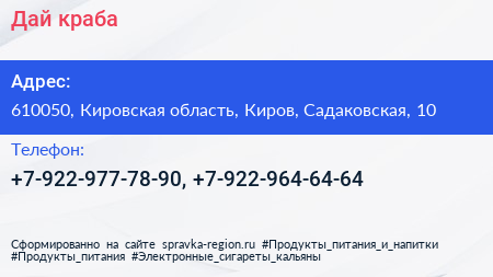 Дай краба по адресу 610050, Кировская область, Киров, Садаковская, 10 в дальнейшем Организация, размещена в следующих категориях: