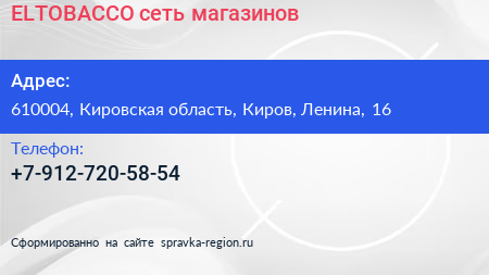 ELTOBACCO, сеть магазинов по адресу 610004, Кировская область, Киров, Ленина, 16 в дальнейшем Организация, размещена в следующих категориях:
