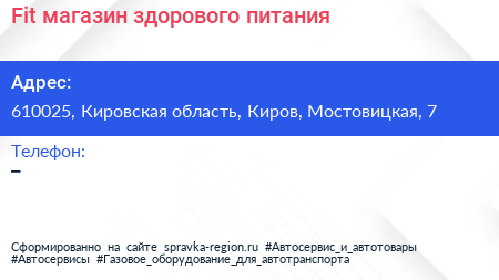Fit, магазин здорового питания по адресу 610025, Кировская область, Киров, Мостовицкая, 7 в дальнейшем Организация, размещена в следующих категориях: