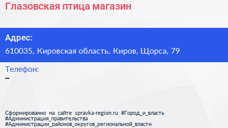 Глазовская птица, магазин по адресу 610035, Кировская область, Киров, Щорса, 79 в дальнейшем Организация, размещена в следующих категориях: