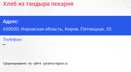 Хлеб из тандыра, пекарня по адресу 610020, Кировская область, Киров, Пятницкая, 33 в дальнейшем Организация, размещена в следующих категориях: