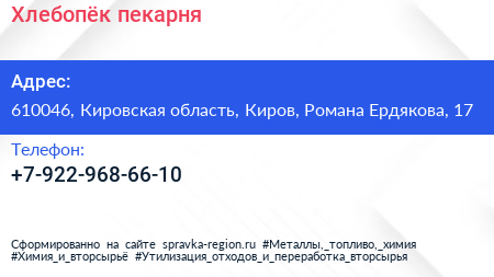 Хлебопёк, пекарня по адресу 610046, Кировская область, Киров, Романа Ердякова, 17 в дальнейшем Организация, размещена в следующих категориях: