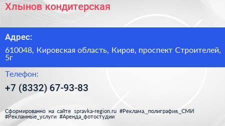 Хлынов, кондитерская по адресу 610048, Кировская область, Киров, проспект Строителей, 5г в дальнейшем Организация, размещена в следующих категориях: