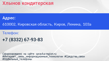 Хлынов, кондитерская по адресу 610002, Кировская область, Киров, Ленина, 103а в дальнейшем Организация, размещена в следующих категориях: