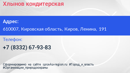 Хлынов, кондитерская по адресу 610007, Кировская область, Киров, Ленина, 191 в дальнейшем Организация, размещена в следующих категориях: