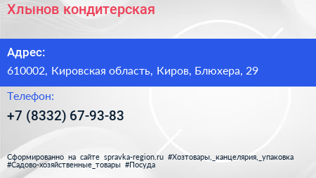 Хлынов, кондитерская по адресу 610002, Кировская область, Киров, Блюхера, 29 в дальнейшем Организация, размещена в следующих категориях:
