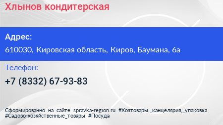 Хлынов, кондитерская по адресу 610030, Кировская область, Киров, Баумана, 6а в дальнейшем Организация, размещена в следующих категориях: