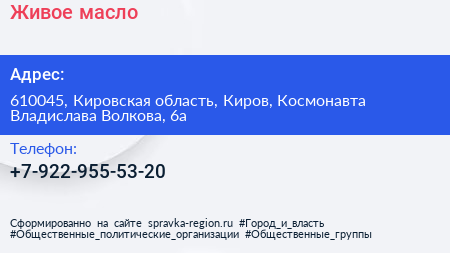 Живое масло по адресу 610045, Кировская область, Киров, Космонавта Владислава Волкова, 6а в дальнейшем Организация, размещена в следующих категориях: