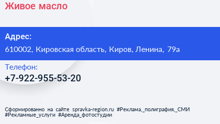 Живое масло по адресу 610002, Кировская область, Киров, Ленина, 79а в дальнейшем Организация, размещена в следующих категориях: