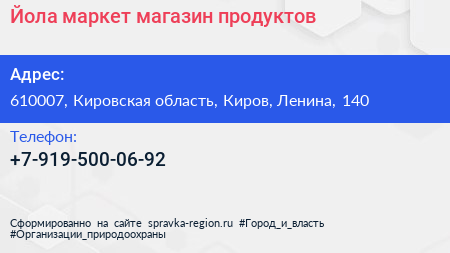 Йола-маркет, магазин продуктов по адресу 610007, Кировская область, Киров, Ленина, 140 в дальнейшем Организация, размещена в следующих категориях: