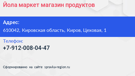 Йола-маркет, магазин продуктов по адресу 610042, Кировская область, Киров, Цеховая, 1 в дальнейшем Организация, размещена в следующих категориях: