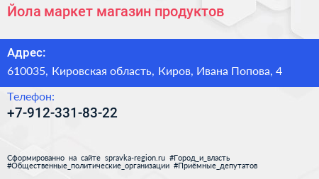 Йола-маркет, магазин продуктов по адресу 610035, Кировская область, Киров, Ивана Попова, 4 в дальнейшем Организация, размещена в следующих категориях: