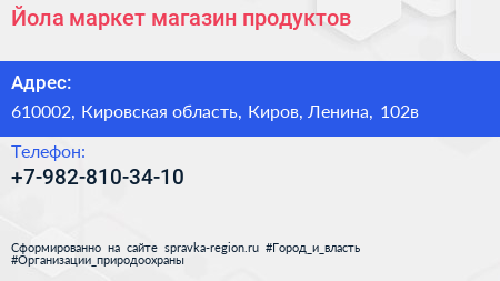 Йола-маркет, магазин продуктов по адресу 610002, Кировская область, Киров, Ленина, 102в в дальнейшем Организация, размещена в следующих категориях: