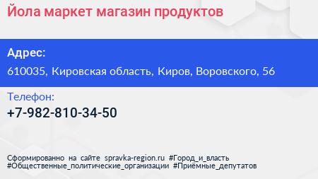 Йола-маркет, магазин продуктов по адресу 610035, Кировская область, Киров, Воровского, 56 в дальнейшем Организация, размещена в следующих категориях: