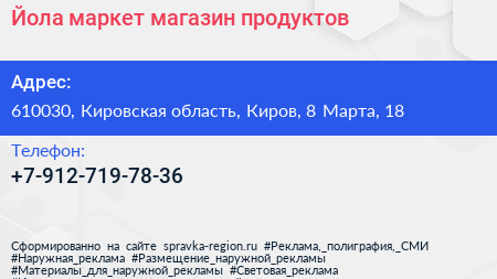 Йола-маркет, магазин продуктов по адресу 610030, Кировская область, Киров, 8 Марта, 18 в дальнейшем Организация, размещена в следующих категориях: