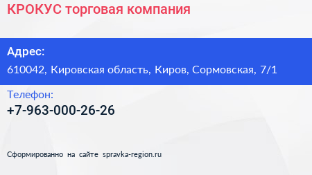 КРОКУС, торговая компания по адресу 610042, Кировская область, Киров, Сормовская, 7/1 в дальнейшем Организация, размещена в следующих категориях: