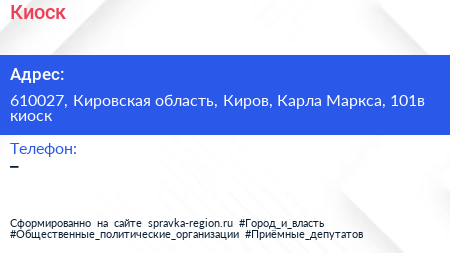 Киоск по адресу 610027, Кировская область, Киров, Карла Маркса, 101в киоск в дальнейшем Организация, размещена в следующих категориях: