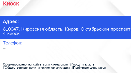 Киоск по адресу 610047, Кировская область, Киров, Октябрьский проспект, 4 киоск в дальнейшем Организация, размещена в следующих категориях: