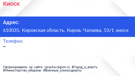 Киоск по адресу 610035, Кировская область, Киров, Чапаева, 53/1 киоск в дальнейшем Организация, размещена в следующих категориях: