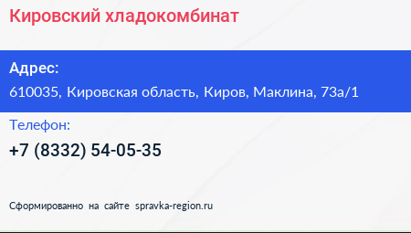 Кировский хладокомбинат по адресу 610035, Кировская область, Киров, Маклина, 73а/1 в дальнейшем Организация, размещена в следующих категориях: