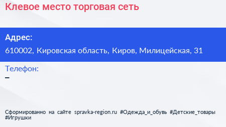 Клевое место, торговая сеть по адресу 610002, Кировская область, Киров, Милицейская, 31 в дальнейшем Организация, размещена в следующих категориях: