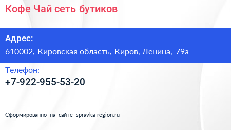 Кофе & Чай, сеть бутиков по адресу 610002, Кировская область, Киров, Ленина, 79а в дальнейшем Организация, размещена в следующих категориях: