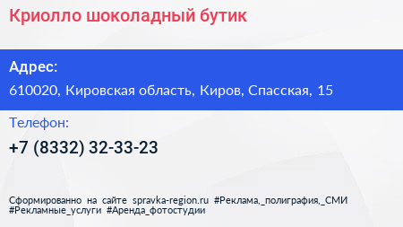 Криолло, шоколадный бутик по адресу 610020, Кировская область, Киров, Спасская, 15 в дальнейшем Организация, размещена в следующих категориях: