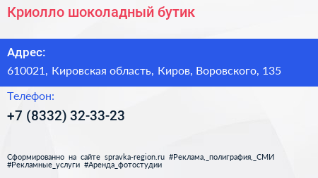 Криолло, шоколадный бутик по адресу 610021, Кировская область, Киров, Воровского, 135 в дальнейшем Организация, размещена в следующих категориях: