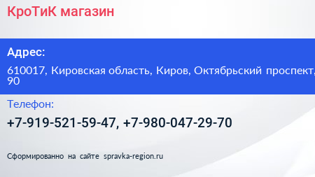 КроТиК, магазин по адресу 610017, Кировская область, Киров, Октябрьский проспект, 90 в дальнейшем Организация, размещена в следующих категориях: