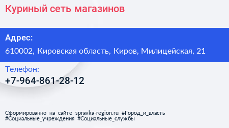 Куриный, сеть магазинов по адресу 610002, Кировская область, Киров, Милицейская, 21 в дальнейшем Организация, размещена в следующих категориях: