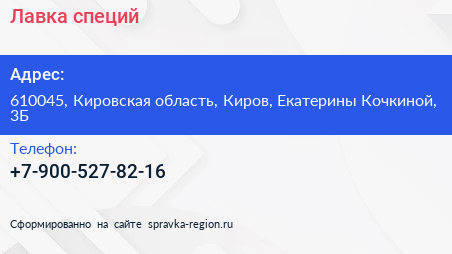 Лавка специй по адресу 610045, Кировская область, Киров, Екатерины Кочкиной, 3Б в дальнейшем Организация, размещена в следующих категориях: