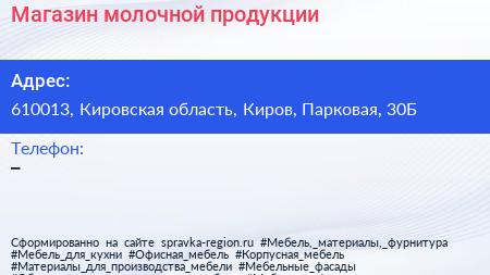Магазин молочной продукции по адресу 610013, Кировская область, Киров, Парковая, 30Б в дальнейшем Организация, размещена в следующих категориях: