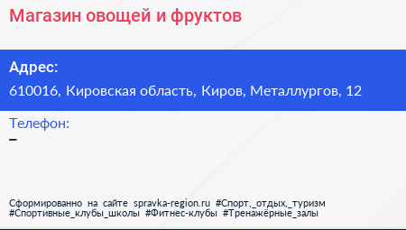 Магазин овощей и фруктов по адресу 610016, Кировская область, Киров, Металлургов, 12 в дальнейшем Организация, размещена в следующих категориях: