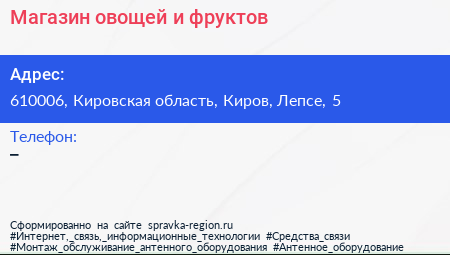 Магазин овощей и фруктов по адресу 610006, Кировская область, Киров, Лепсе, 5 в дальнейшем Организация, размещена в следующих категориях: