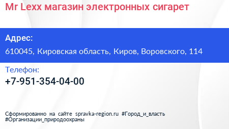 Mr.Lexx, магазин электронных сигарет по адресу 610045, Кировская область, Киров, Воровского, 114 в дальнейшем Организация, размещена в следующих категориях: