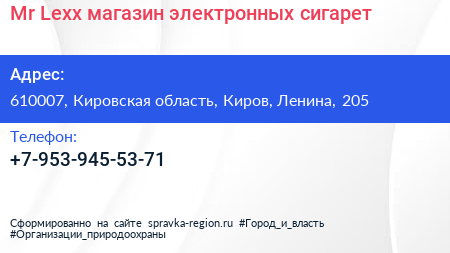 Mr.Lexx, магазин электронных сигарет по адресу 610007, Кировская область, Киров, Ленина, 205 в дальнейшем Организация, размещена в следующих категориях: