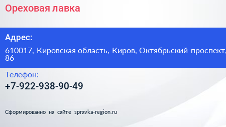 Ореховая лавка по адресу 610017, Кировская область, Киров, Октябрьский проспект, 86 в дальнейшем Организация, размещена в следующих категориях: