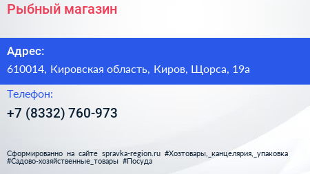 Рыбный магазин по адресу 610014, Кировская область, Киров, Щорса, 19а в дальнейшем Организация, размещена в следующих категориях: