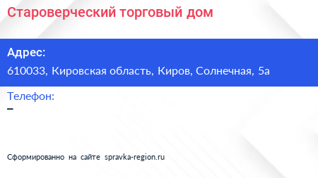 Староверческий, торговый дом по адресу 610033, Кировская область, Киров, Солнечная, 5а в дальнейшем Организация, размещена в следующих категориях: