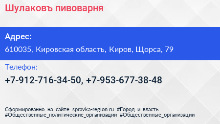 Шулаковъ, пивоварня по адресу 610035, Кировская область, Киров, Щорса, 79 в дальнейшем Организация, размещена в следующих категориях: