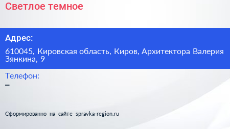 Светлое & темное по адресу 610045, Кировская область, Киров, Архитектора Валерия Зянкина, 9 в дальнейшем Организация, размещена в следующих категориях: