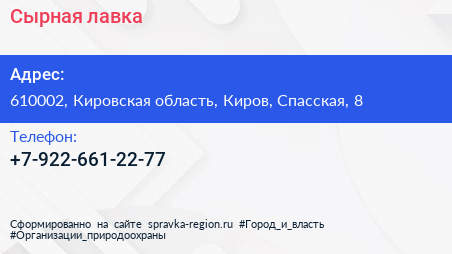 Сырная лавка по адресу 610002, Кировская область, Киров, Спасская, 8 в дальнейшем Организация, размещена в следующих категориях: